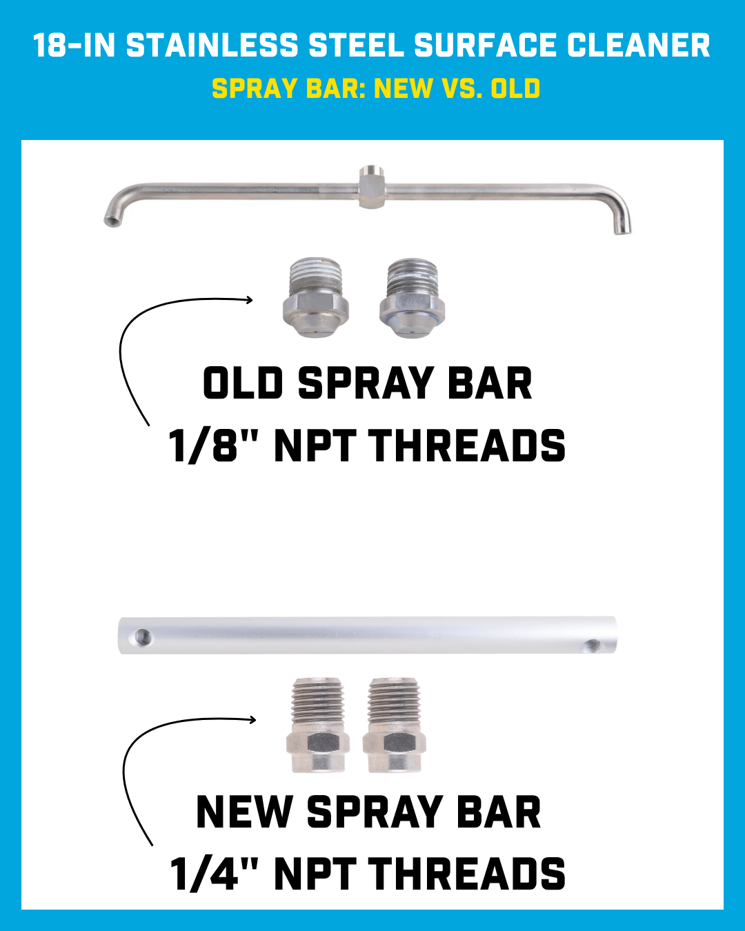 The 18" Stainless Steel Surface Cleaner has an updated spray bar. The old spray bar (curved ends) has 1/8" threaded spray tips. The new spray bar has 1/4" threads. See image below for reference.